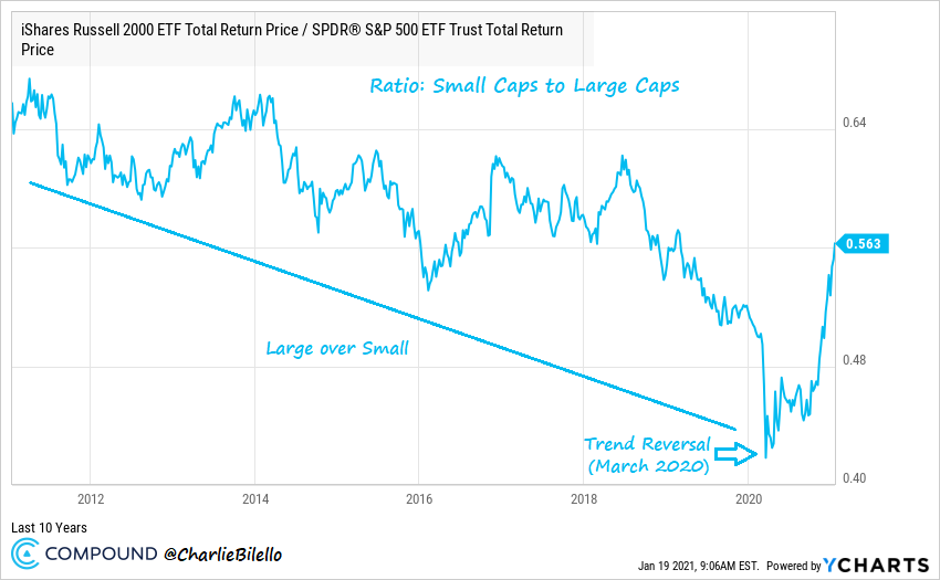 This week, we look small company outperformance, stock returns under Trump, and the current reversal of major trends.
