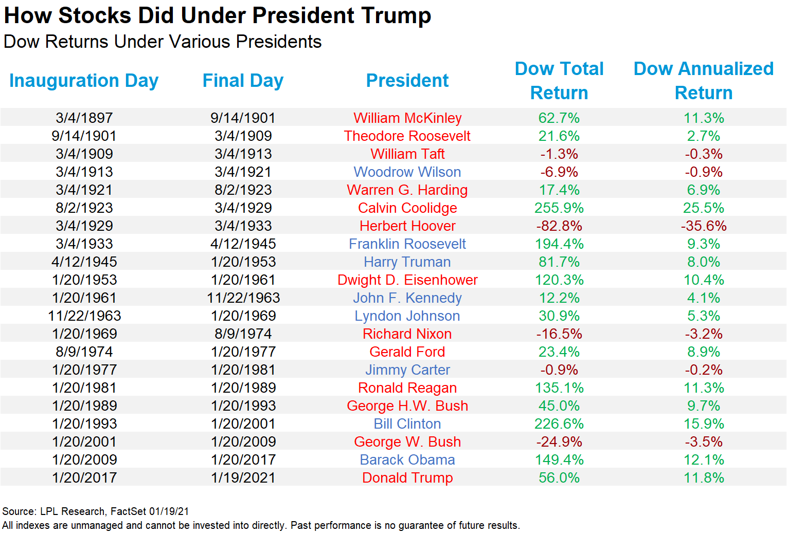 The Dow Jones Industrial Average (Dow) gained approximately 56% during Trump’s four years in office, which comes out to an annualized return of an impressive 11.8%. President Trump’s annualized Dow return of 11.8% was the best for any Republican president since President Calvin Coolidge in the Roaring Twenties, but this was still below the annualized returns of Presidents Bill Clinton and Barack Obama.